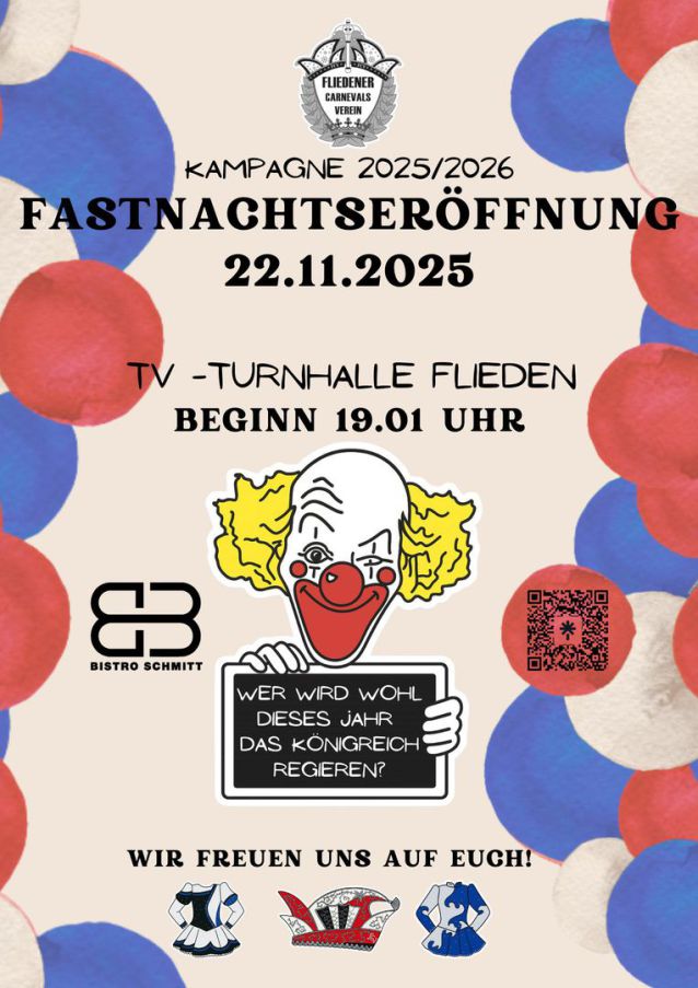 Ab 19:01 Uhr wollen wir mit Euch gemeinsam in der TV-Turnhalle Flieden gemeinsam feiern. Traditionell werden wir hier unser Prinzenpaar für die kommende Kampagne bekannt geben.